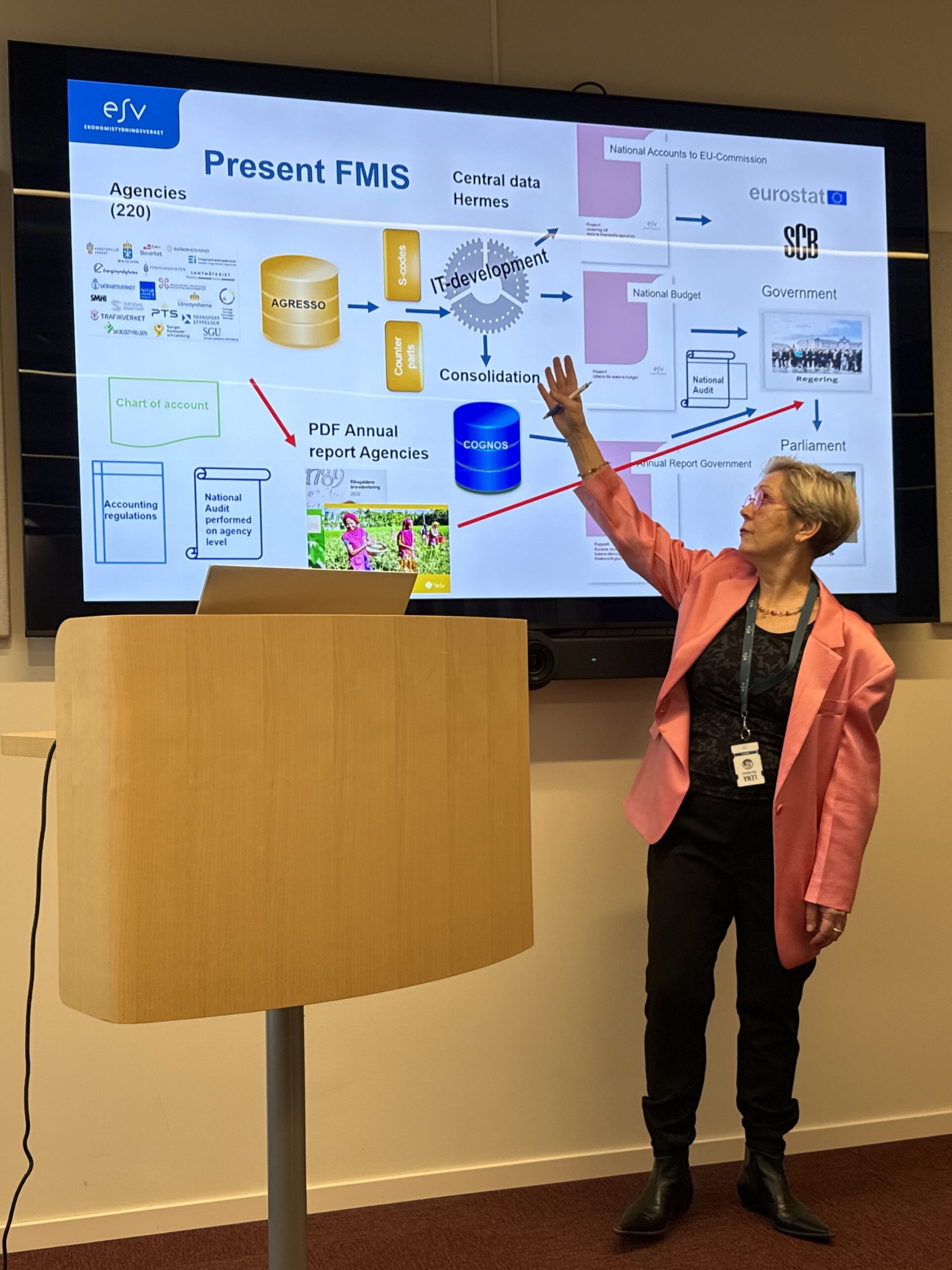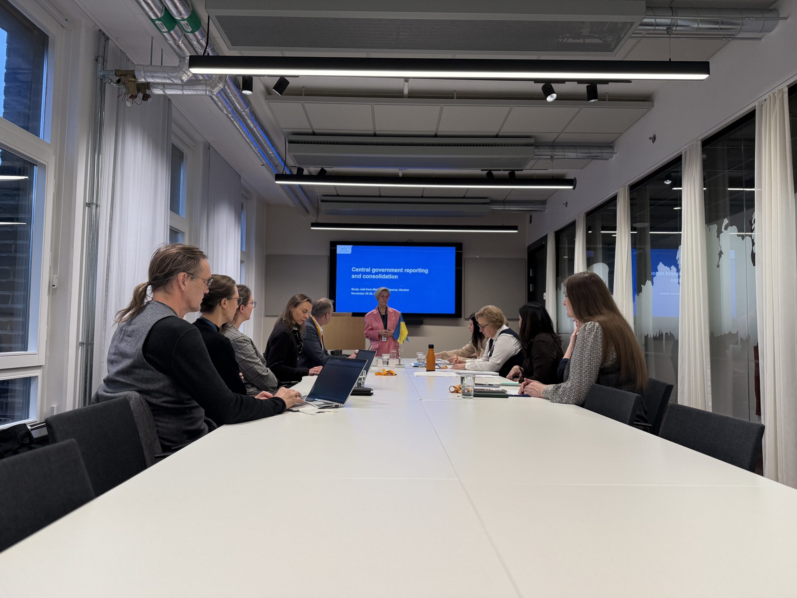 Останній день навчального візиту EU4PFM для представників Міністерства фінансів України розпочався у Шведському національному агентстві з фінансового менеджменту (ESV). Лена Мальмквіст, керівниця підрозділу, представила, як у Швеції організовано фінансову звітність центрального уряду та її консолідацію. Вона розповіла про національну модель бухобліку, план рахунків і порядок подання фінансових даних органами влади до ESV. Учасники ознайомилися з тим, як ця інформація консолідується в річному звіті центрального уряду, та переглянули приклади реальних звітних матеріалів. ESV також окреслило ІТ-інфраструктуру, яка забезпечує цей процес, включно із чинною системою FMIS та планами її оновлення.