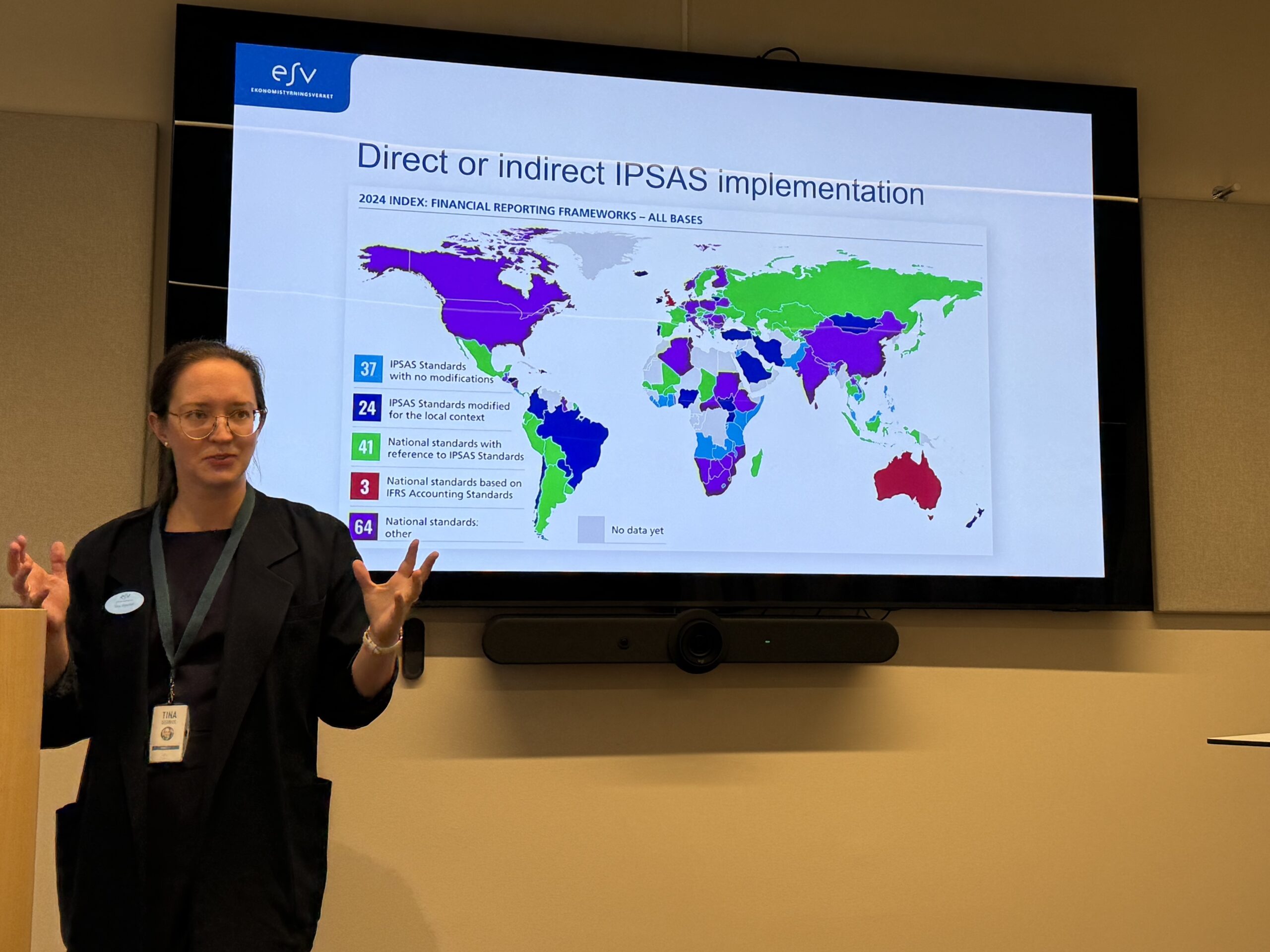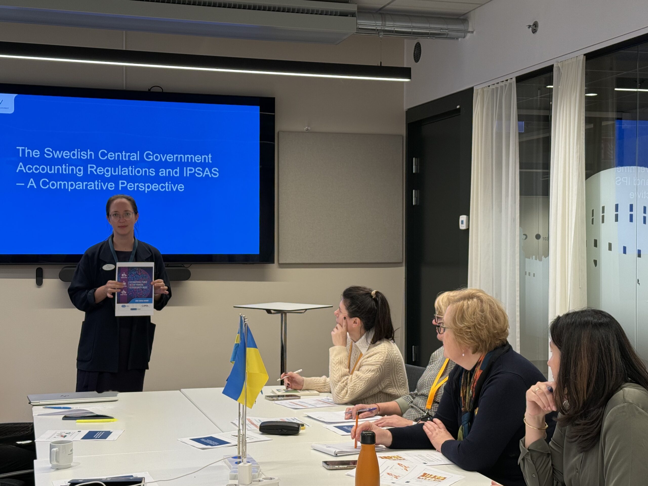 Після обіду делегація повернулася до ESV на сесію, присвячену Міжнародним стандартам бухгалтерського обліку для державного сектору (IPSAS). Старші радниці Ульріка Сандстедт і Тіна Сігоніус поділилися досвідом Швеції щодо адаптації державного бухобліку до міжнародних стандартів та участі ESV у міжнародних платформах співпраці. Також йшлося про академічні дослідження у сфері обліку результативності, розвиток методів підготовки фінансової звітності для державного сектору та нові напрями, включно зі звітністю зі сталого розвитку.